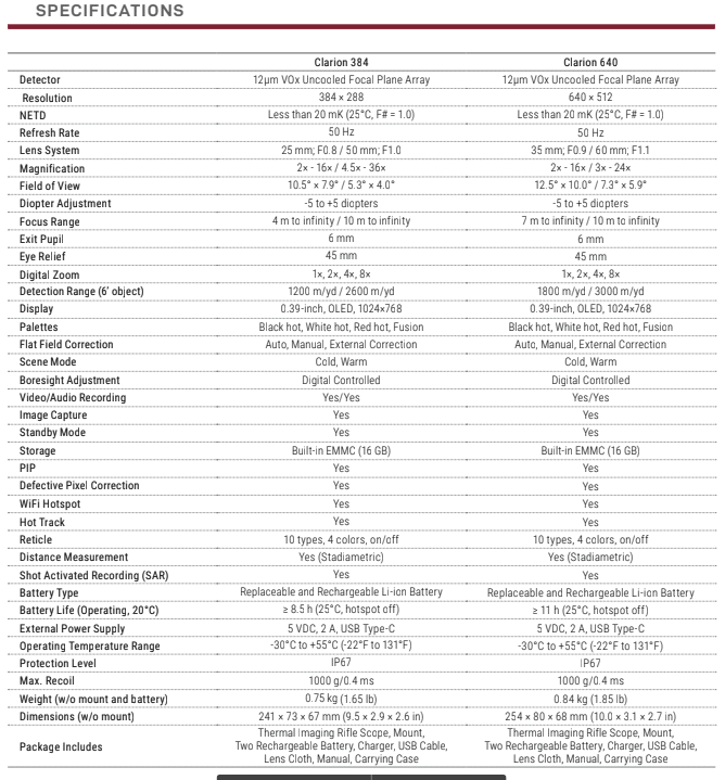 While the Clarion utilizes an advanced new optical system, AGM made sure to preserve the design elements that hunters have come to expect: high quality 384x288 12-micron thermal sensor, removable and rechargable battery, up to 11 hours of continuous battery life on a single charge (2 batteries included), 10 internal reticle options, 5 different customizable zeroing profiles, 10 different brightness and contrast settings, wifi hotspot capability, built-in recording with sound and image capture storage, AGM Connect app compatibility, 4 different reticle colors, 4 color palettes, 5 image sharpness settings, and a high-quality American Defense mount that works well both AR and bolt-action shooting platforms.