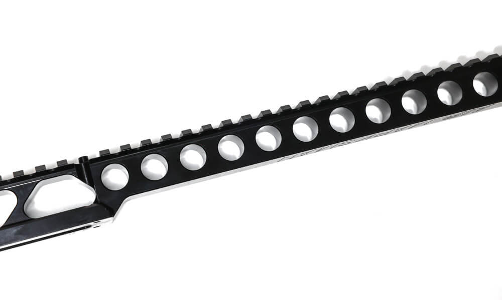 The Backbone Rail from AirMarksman is more than just an extended optics rail. It is compatible with Impact models up to the M3. The Backbone Rail has been designed to tie your entire rifle together and eliminate tolerance stacking by replacing both the factory optics rail as well as the factory backbone plate with one piece of extra rigid aircraft-grade aluminum. The AirMarksman Backbone Rail drastically reduces flex in the entire rifle, creating a more anchored and consistent shooting platform at the cost of only 4 added ounces to the total weight of the rifle. On top of stiffening the Impact platform, the Backbone Rail features a full 18 inches of Picatinny optics rail, the most useable rail space of any rail system on the market, with 30 MOA of elevation milled into the rail. Based on input from top NRL Airgun Class shooters, AirMarksman also added a bolt retention detent to the Backbone rail that keeps the cocking handle and bolt probe held in the rear position when it is opened. This feature prevents accidental double feeds and removes play in the cocking handle. The bolt retention detent can easily be removed during the installation process if shooters are looking to maintain the factory cocking handle feel. 100% made in the USA, the AirMarksman Backbone Rail System is the ultimate precision top rail for the FX Impact Platform.
