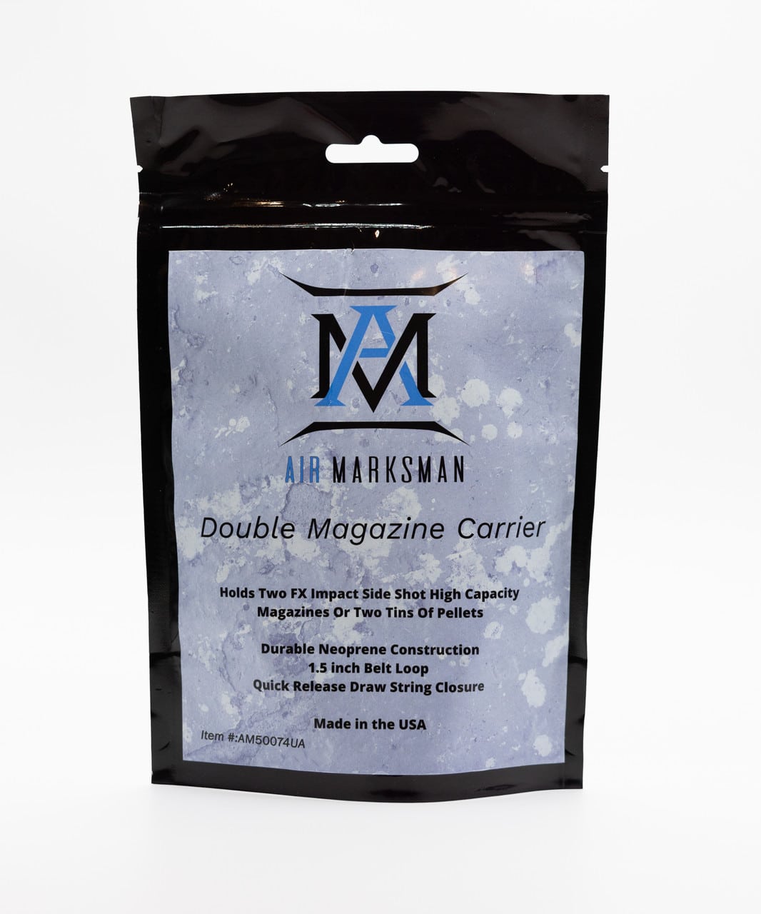 These dual magazine holders are the perfect way to carry extra ammo in the field or at shooting matches. Designed to carry two FX Impact Side-Shot style magazines or 2 standard size pellet tins. Made from high quality neoprene and featuring a quick release elastic closure, making inserting and retrieving mags and pellet tins quick and easy. Features a 1.5 inch belt loop so it can be secured on a belt, backpack strap, or shooting bag. Designed and Made in the USA.