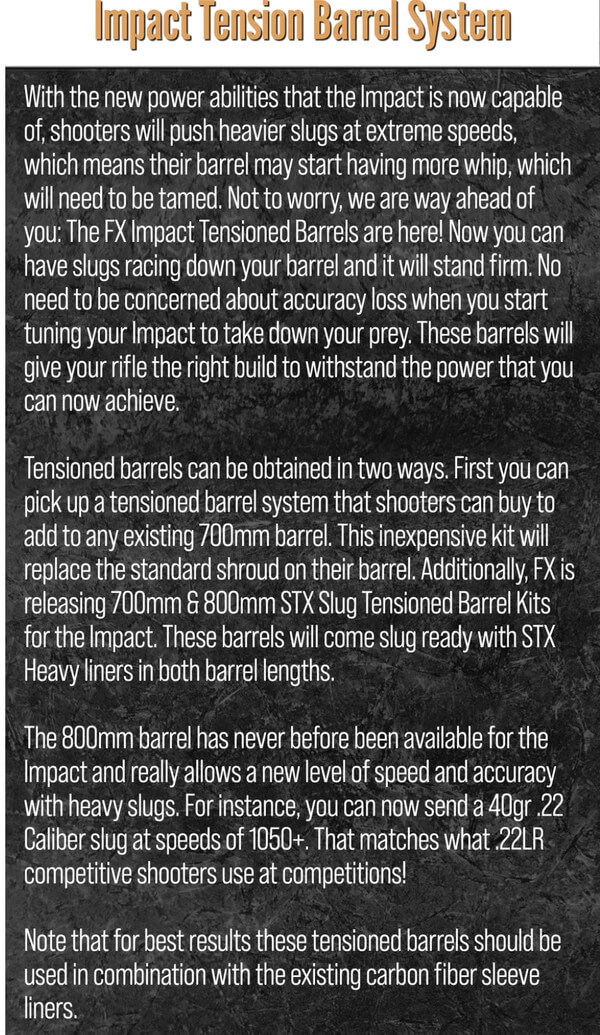 The FX Impact Barrel Tensioner Kits will stiffen up that 700mm Impact Barrel with this kit! Easy enough to install yourself!