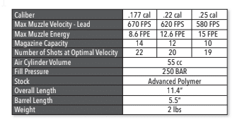 - Max Velocity* – Lead Pellets –620 FPS – .22; 580 FPS – .25