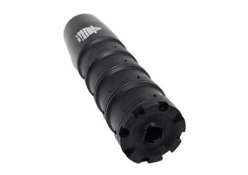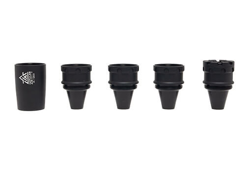Small caliber rated modular moderator. Elongate or shorten with the four included baffles, or change up the look by adding colored baffles. Includes base and four baffles.