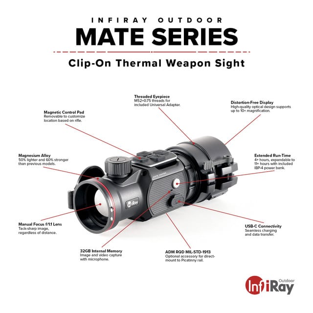 The InfiRay Outdoor MATE Clip-On Thermal Rifle Scope takes the versatility of your existing day scope to an all-new level. With magnesium alloy housing, a high-performance 12 μm detector, a distortion-free display, and a removable control pad, the MATE series guarantees a precise and repeatable transition from day to night. You can mount the MATE directly to the objective of your day scope or you can attach it via a MIL-STD-1913 Picatinny rail. Additional accessories, including an external LRF module and monocular extension, provide better flexibility on your next shooting endeavor.