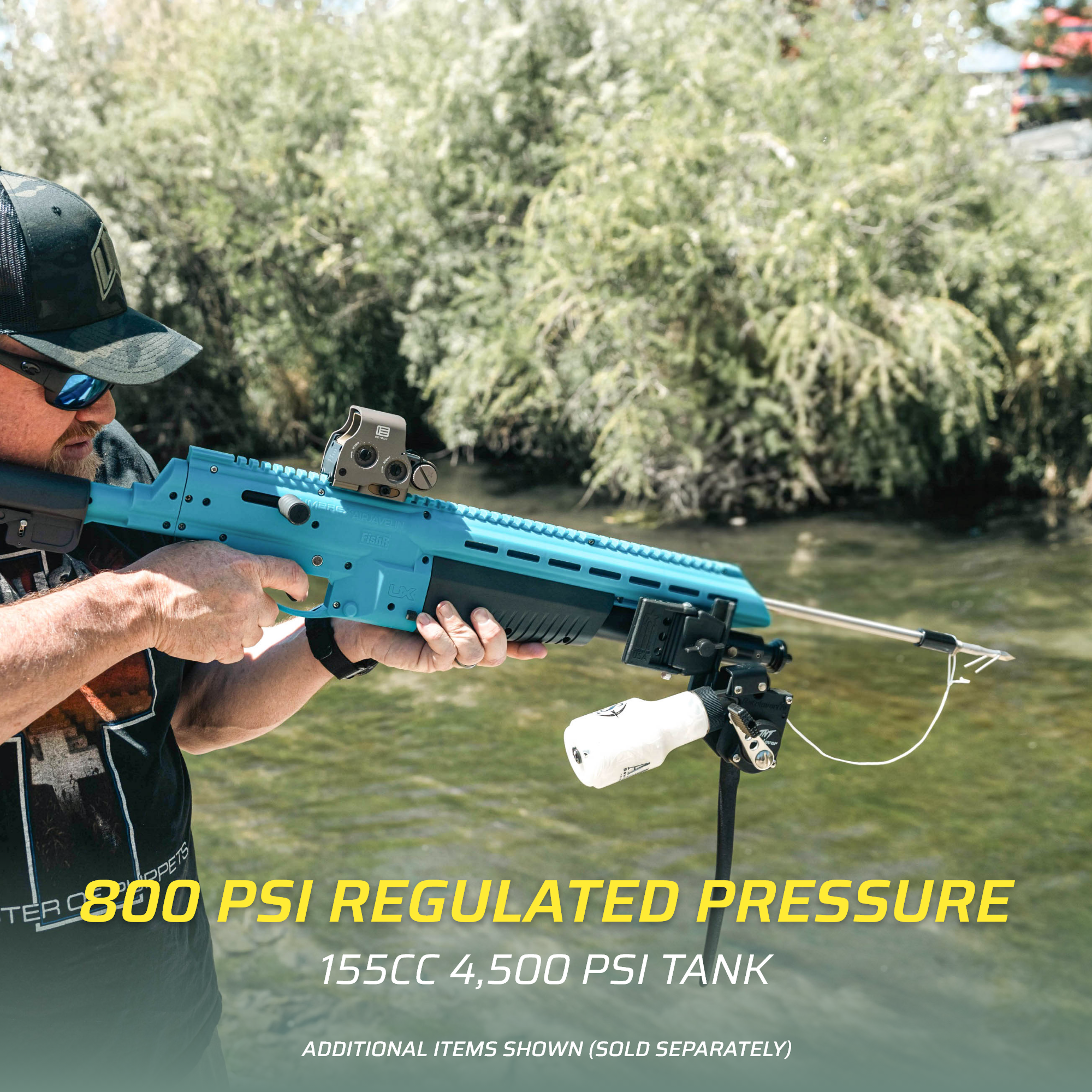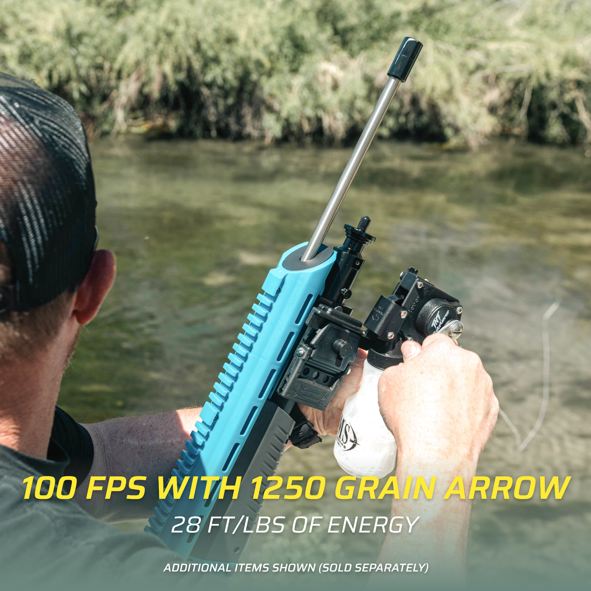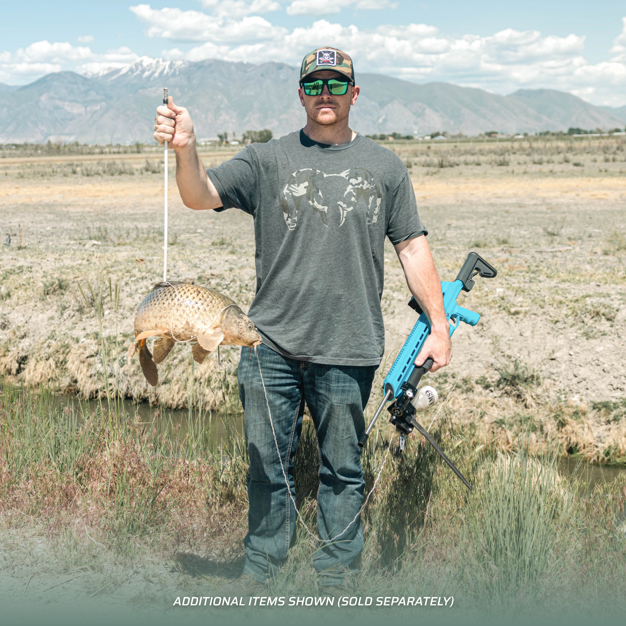 Bring the power of air to bow fishing with the Umarex AirJavelin FishR PCP Airgun. Technically a PCP (pre-charged pneumatic) airgun, the AirJavelin FishR is powered by high-pressure air stored in a 9.5 cu. in. (155 cc) on-board tank at 4,500 psi. The pressure is regulated to 800 psi, which in turn launches a 1,248 grain solid fiberglass arrow (one arrow included with purchase of the AirJavelin airgun!) at 100 fps generating 28 ft. lbs. at the muzzleAt the tip of the arrow, you'll find an Innerloc Pro Point that runs through and grabs onto the fish like a talon. Depending on the preference of the shooter, they can shoot the FishR intuitively or attach an optic to allow for tuning for the preferred shooting depth and technique.